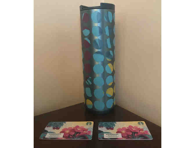 Starbucks aniversary coffee mug & two $25 Starbucks gift cards.