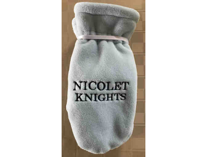 Show your school pride with these handmade light blue fleece mittens embroidered with "Nicolet Knights". Size Large.