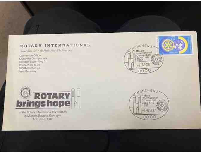 Countries around the world have honored the work of Rotary with commemorative stamps since 1931, when Austria created an overprint — a later printing over an officially issued stamp — in honor of the Rotary International Convention in Vienna. Stamps have commemorated other Rotary Conventions, including those held in Havana in 1940; Tokyo in 1961 and 1978; São Paulo in 1981; and this one up for auction commemorating the event in Munich, Germany, in 1987.