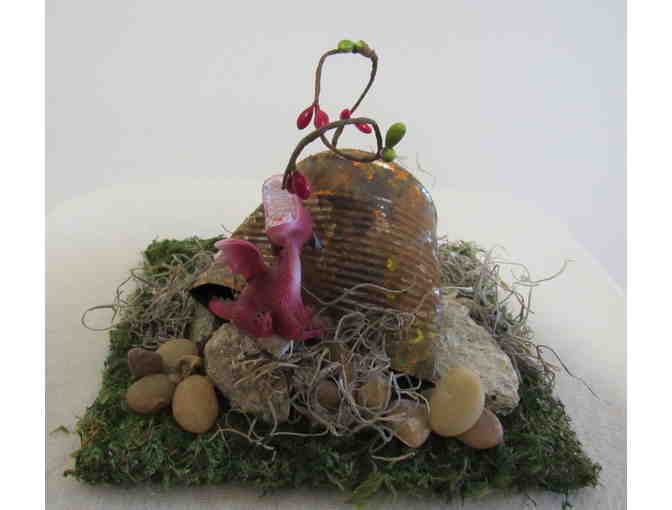 This little garden made from an old can and some recycled moss and plants from an old arrangement is fun. That little dragon is trying to get a berry for breakfast! You know you want to help him.