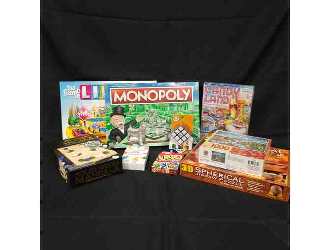Enjoy hours of fun with this bag of board games and puzzles. Bag includes: Life, Monopoly, Mancala, Uno, Candyland, Spot It!, Rubiks cube, Charades for Kids, and 2 puzzles, and Mile Hi popcorn. Plus a $25 gift card for Big Bill's Pizza