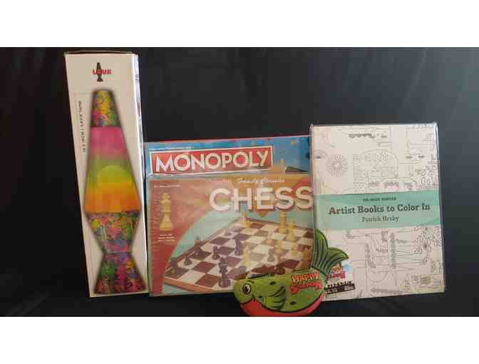 A family game pack is provided by Henry Bear's Park. You'll receive a bag of games including a chess set, Monopoly, the Happy Salmon game, and a hardcover artist book to color in by Patrick Hruby. This set even adds some fun atmosphere with a lava lamp. Set valued at $95.