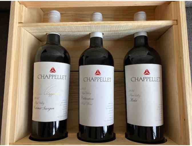 Enjoy 3 bottles of red wine from Chappellet Winery in California. Package includes a wooden wine box filled with a merlot, cabernet, and cultivation red. Valued at $150!