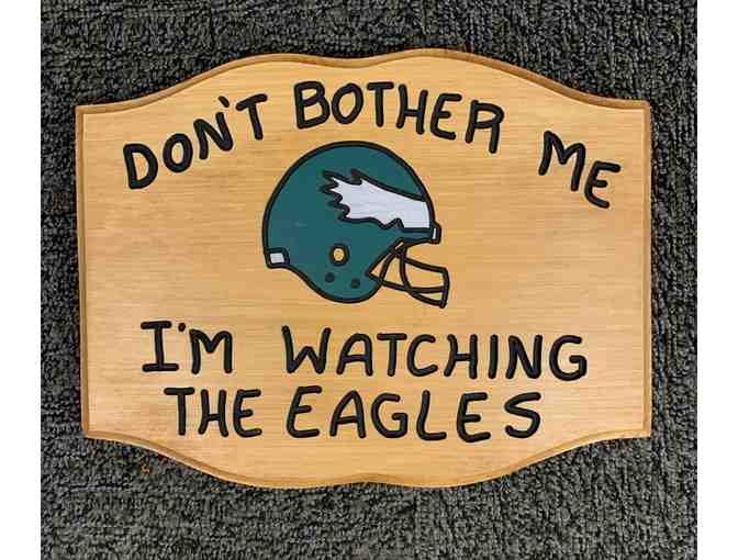 “Don’t Bother Me I’m Watching the Eagles” hand painted and carved sign, complete with an image of their signature green helmet right in the middle of the sign.