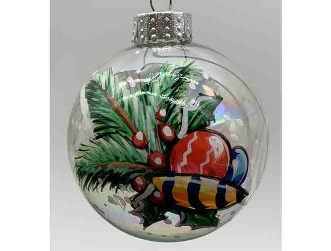 The Ornament Guy, Mike Riehl, hand paints every ornament making them individual and unique. This clear Christmas ornament, decorated with pine branches, holly and Christmas ornaments, is "shatterproof" for those of you with cats, dogs, kids or "butter fingers!" Snow and white swirls decorate the back to make this a festive decoration for your tree.