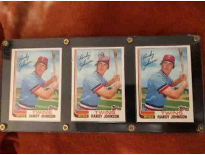 Three (3) 1982 TOPPS baseball cards of Randy Johnson, outfielder with the Minnesota Twins, encased in hard plastic case.
