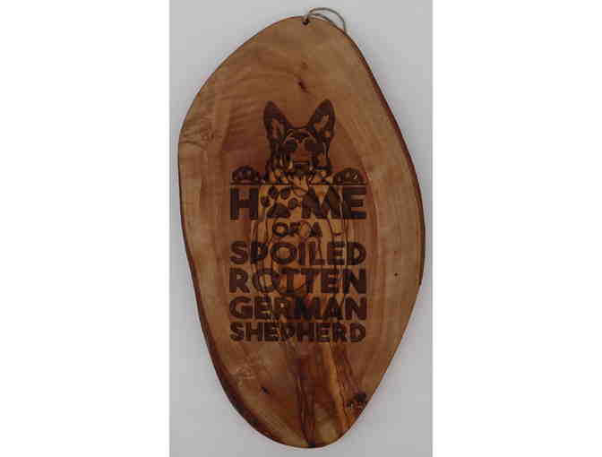 This beautiful hand crafted, laser engraved sign can also be used as a cheeseboard. The laser engraved sign reads, “Home of a Spoiled Rotten German Shepherd” in all capital letters and underneath the face of a friendly German shepherd, ears alert. The 'o' in home is a laser-engraved paw print.