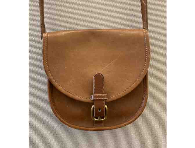 This vintage Coach leather crossbody is a miniture saddlebag! In one of Coach's original colors, British Tan, the purse has interior and exterior pockets. Pristine condition.