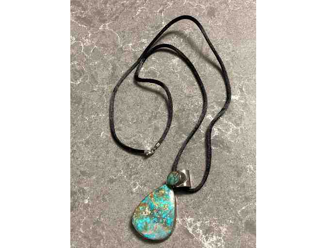 This teardrop turquoise gemstone pendant is rimmed with a sterling silver around the perimeter. It hangs from a small loop around a black cord and fastens with a lobster claw catch. Turquoise pendant gemstone comes from New Mexico.