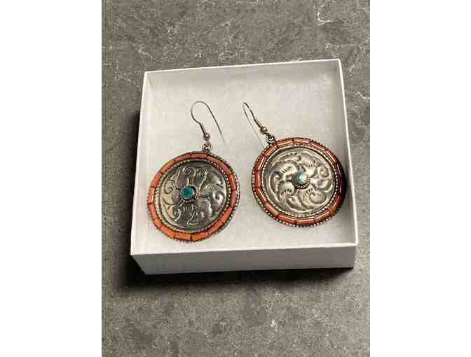 Looking for that special piece to add flair to your look? These large silver disk shaped earrings from Nepal are lightweight and will surely draw admirers. Each earring has a single turquoise stone in the center surrounded by Nepalese swirls and coral stones on the outer edge.
