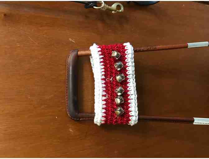 This crocheted decoration is perfect for holiday parties so that you can add a little bling to your dog's harness during December.  Decoration slides down over a standard harness handle and has two buttons that help keep it in place and from falling off.  Main color is red with white trim on the top and bottom and is made with acrylic yarn.  There are six silver bells on the front, held in place with gold ribbon, that ties in a bow on the back of the decoration.  These bells produce a quiet jingle if your dog bounces when walking, but are not loud.
