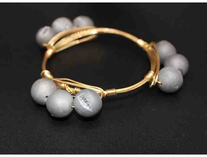 This bangle bracelet has just the shimmer you want! Every Bourbon and Boweties bangle is hand-crafted by women and men in the Tampa Bay Area of Florid and features natural druzy stones that subtly shimmer - which makes this bangle a great compliment for both casual and dressy outfits. The gold plated copper wire-wrapped bangle is adorned with three clusters of 3 dark grey round druzy agate beads, each approximately 14mm in size. The name druzy refers to the formation of small crystals on a mineral surface and druzy stones frequently come from Brazil. Each druzy bead is unique, some have small crystals near the surface and some have a fissure in them and you can see the raw druzy inside the bead. Medium sized bangle (non-adjustable): 8-1/4" circumference, 2-5/8" diameter