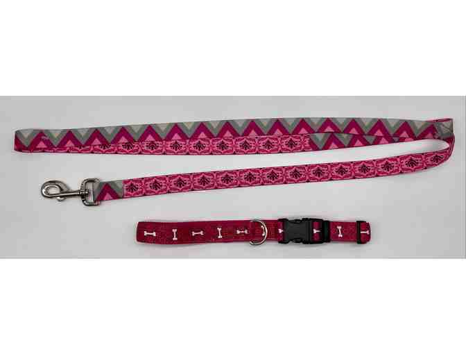 Dress up your pet dog in the most fashionable styles with this matching collar and leash. Donated by Coastal Pet Products, this 1" nylon woven web collar is hot pink with a geometric design and white bones adjusts to fit 18"-26" necks. A sturdy plastic clasp makes this collar strong enough to withstand the rigors of play without coming apart and it is easy to attach a leash to the classic metal D ring. The matching leash is a silky and smooth 1" x 6' leash with pink/maroon/grey zig zag pattern on one side and pink & maroon fleur-de-lis pattern on the other side. Dress up your pet and take a walk, in style!