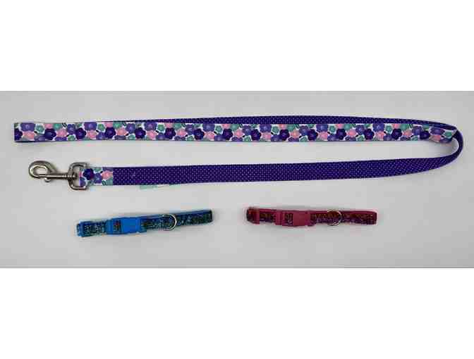 matching leash-1" x 6’ leash is covered with teal, pink and purple flowers on one side and purple with tiny white polka-dots on the reverse side.