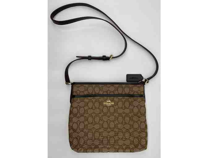 Coach's Messenger bag is a versatile crossbody is crafted of our lightweight, signature, jacquard and trimmed with brown refined calf leather. The gold zipper closure keeps all your essentials safe and an exterior slip pocket is perfect for your phone. Adjustable brown leather buckle strap with 21-3/4" drop is perfect for shoulder or crossbody wear. This is an authentic Coach with label attached (bar code and style).