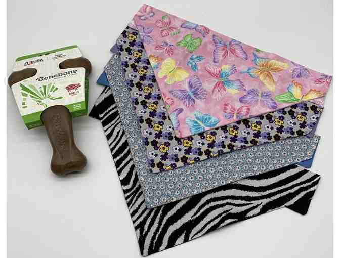 Four Girl Pup Bandannas and a Large Bacon Benebone