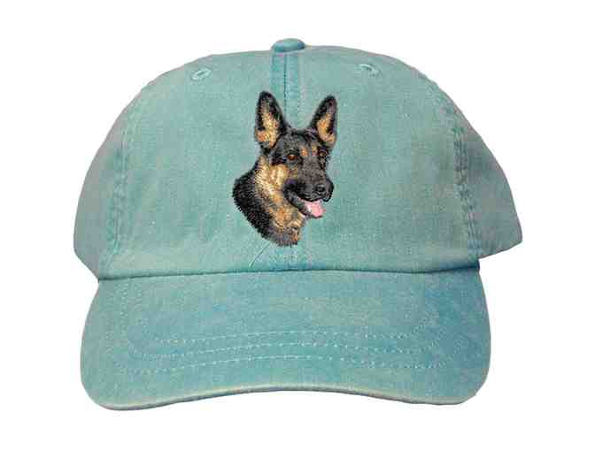 This baseball cap is light blue and embroidered with a black and tan German shepherd head on the front.