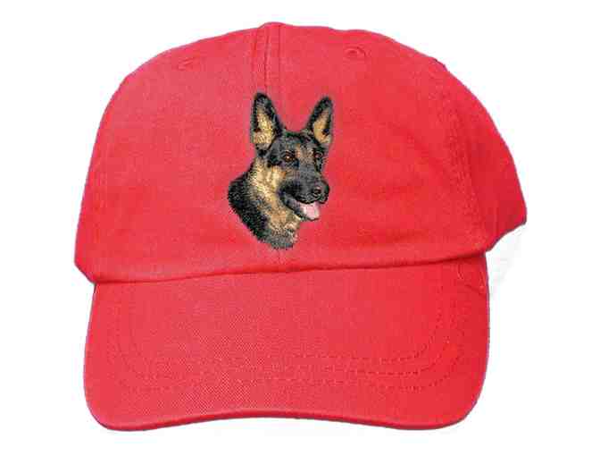 Bid on this fun red baseball cap, embroidered with a black and tan German shepherd head on the front.