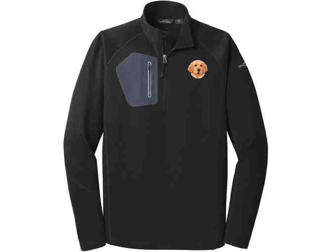 Show off your golden retriever pride in style and comfort with this embroidered Eddie Bauer Half Zip Performance Fleece Jacket! This Men's XL black fleece jacket has a half zip pocket over the right chest, and an embroidered golden retriever head over the left chest.