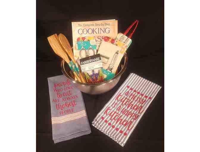 This basket contains a large cookbook, silver mixing bowl, peeler set, multi-clip set, stainless steel silicone tongs, olive wood turner, olive wood spoon, kitchen scissors, and tomato slicer. Also includes two handcrafted dish towels created by Heather Wilson. Towels state, "People who love to eat are always the best people" and "A messy kitchen is a happy kitchen".