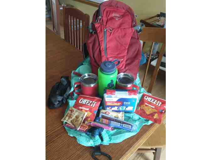 Osprey Daylite Pack, hammock, 2 insulated mugs, snacks, first aid kit, Nalgine water bottle.