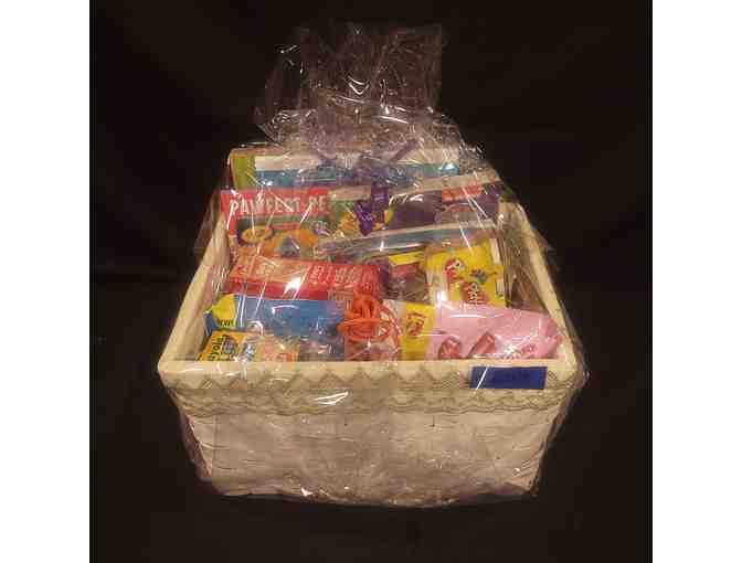 Basket includes: Jump rope, candy, playdough & playdough fun factory, coloring book, crayons, twirled paper art kit, cartoon DVD, microwave popcorn, washable paint set, paintbrushes, glow beach ball, FunFetti sugar cookie mix, construction paper, glue stick (3pk), Pawfert Pets sticker face fun activity book, 20 sheets paint paper.