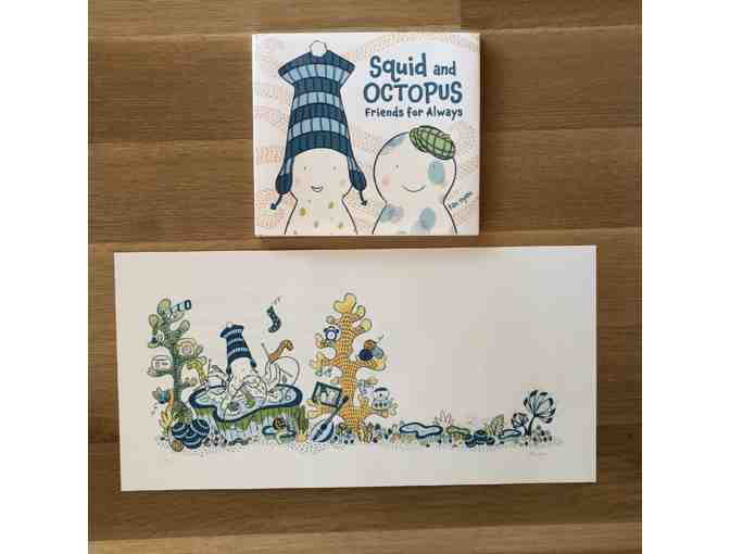 hand-pulled silkscreen print plus signed book of Squid and Octopus: Friends For Always, written and illustrated by Waverly parent Tao Nyeu. 12"h x24"w, signed print 2 of 10.