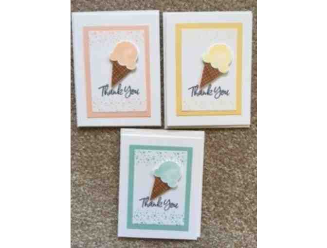 Includes 6 homemade cards made by a Stampin' Up demonstrator.  Each card comes with a custom stamped envelope and the inside of the cards have messages and stamps on them too.  Beautiful and handy to have when needed.