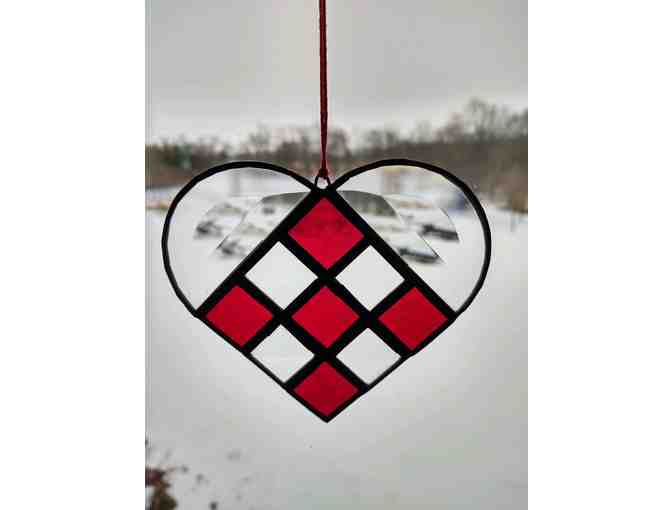 This handmade stained glass heart will be a beautiful addition to any window. This heart has beveled glass. Heart measures 5 1/8 inches wide and 4 3/4 inches tall.