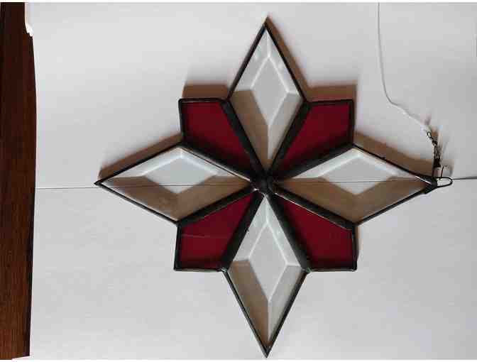 This handmade stained glass star will shine brightly in any window.  This star has beveled glass.  The star measures 8 inches wide and 8 inches tall.