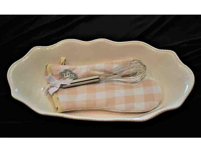 Large Ceramic Dish with Whisk and Decorative Towel