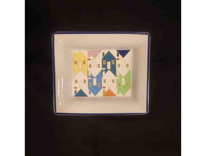 This cheerful plate was created in support of Habitat for Humanity and can be used for special desserts or as a catch-all for trinkets. Plate measures 4x5" inside and 6 3/4 x 7 3/4" on the outside.