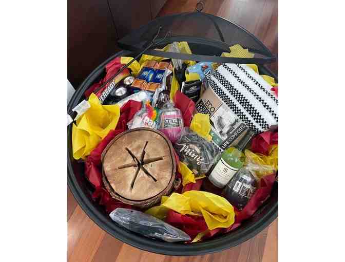 This basket includes: wood burning fire pit, marshmallows, graham crackers, chocolate bars, 2 gourmet chocolate bars, Roasting sticks, hot cocoa, flashlights, 2 bottles of wine, Baileys, Wood Fire starter, 2 yeti wine tumblers and a cozy blanket.
