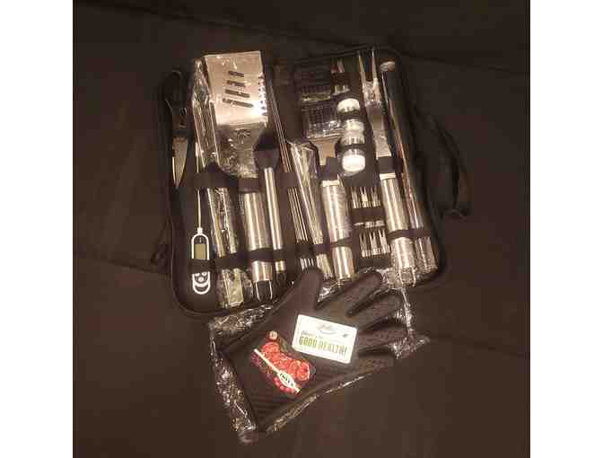 Kick your summer grilling off right with this new 31 piece stainless steel grilling set by Grilljoy. Includes a storage case. Purchase scrumptious food to grill with a $25 gift certificate from Tony's and $25 gift certificate from Sprouts.