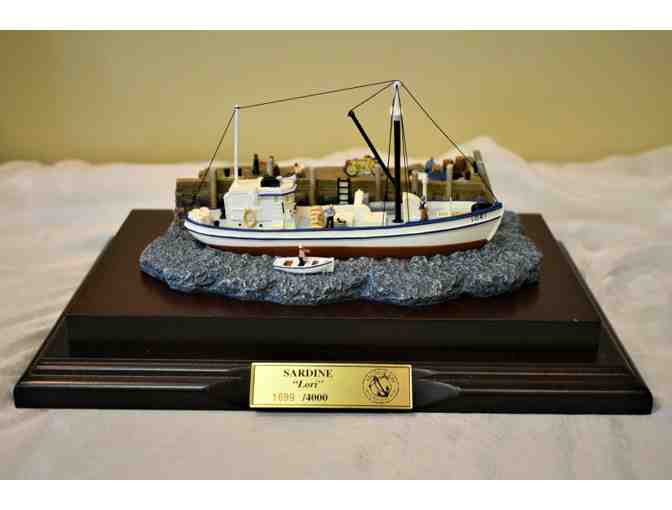 Bid to win this detailed Sardine "Lori" Model Boat by Anchor Bay. Model 1699/4000. Cold cast resin model boat comes with wood display base and glass and mirror case. Retired Numbered limited edition of 4000.