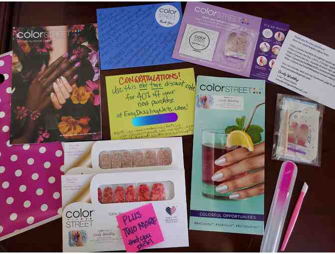Enjoy this fantastic set of ColorStreet nail polishes and more! This set comes with 2 sets of color polish PLUS two more that you pick and an added glass Emory board and cuticle tool. Also includes a one time discount of 40% of your next purchase at EasyDazzlingNails.com. Never used ColorStreet nail polish before? No worries! Cindy will help you successfully apply your first set and you may never go back to regular nail polish.