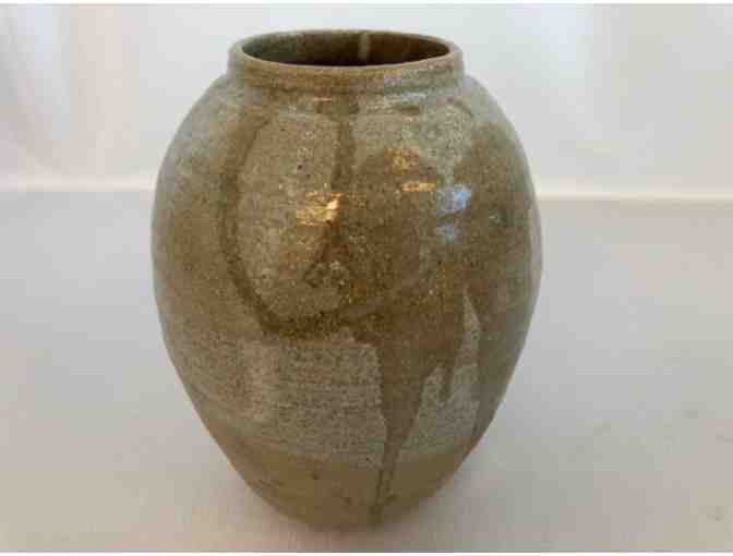 This beautiful hand thrown earth tone vase features a light glaze and measures 8 by 6 inches.