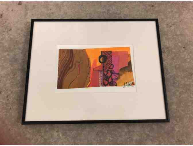 This original mixed media piece is by artist Jeanine Abels of Bloomington. The collage was created with brilliant tones of red, oranges, and pink. Jeanine is an internationally known and sought after artist for her beautiful Asian arts and philosophy style. The piece measures 14 by 11 inches matted and framed.