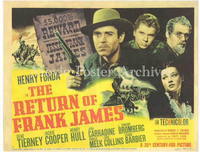 The Return of Frank James, the 1940 Fritz Lang outlaw western sequel starring Henry Fonda, Gene Tierney, Jackie Cooper, Hunry Hull, John Carradine, J. Edward Bromberg, Donald Meek, Eddie Collins, George Barbier, Russell Hicks and Ernest Whitman.