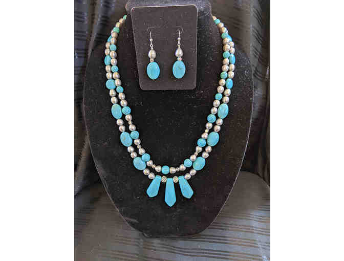 Bid to win this homemade turquoise howlite, silver freshwater rice pearls with sterling silver double strand necklace and earrings set.