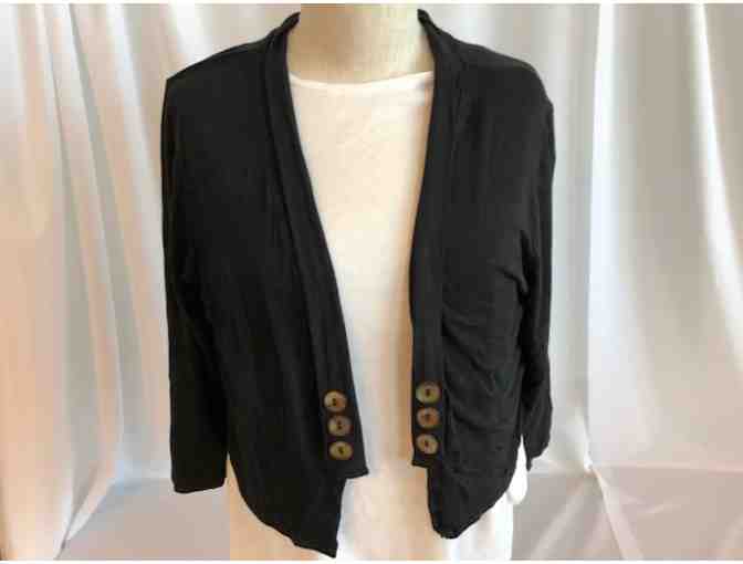 This crop jacket is a fun piece to top most anything. The 3/4 length sleeves and button placket defines the look. Think back to the gallant days of waist coats given a modern feminine twist.