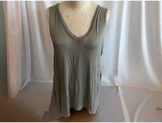 This sleeveless tunic is soft and comfy. The color is actually called Ash which is a light grey. The open back detail and cascading drape are an added surprise! Wear as a casual piece with shorts or pants - or use as a swimsuit coverup.
