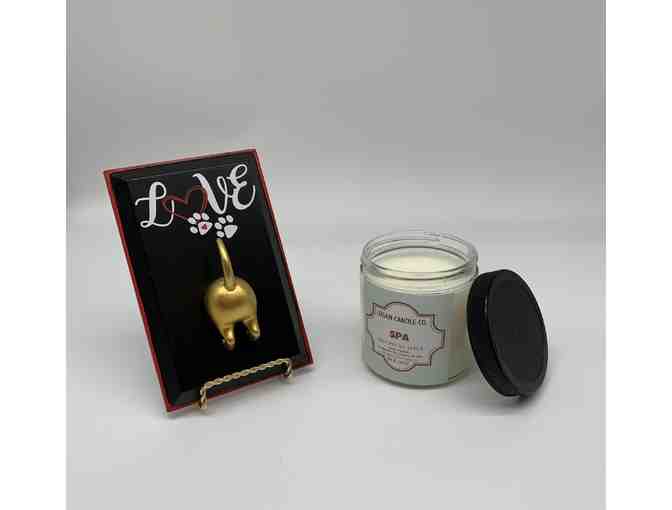 Give yourself an at-home spa day with this hand-poured candle scented with sage, pecan, and apple. This 24 oz candle is made of soy blended wax. Included in this lot is a small hand-painted plaque with a gold dog behind mounted on it. The tail curves up for use as a leash hook. Red and white script lettering above the hook reads, "Love" with a heart for the letter O. Two paw prints are painted beneath the text.
