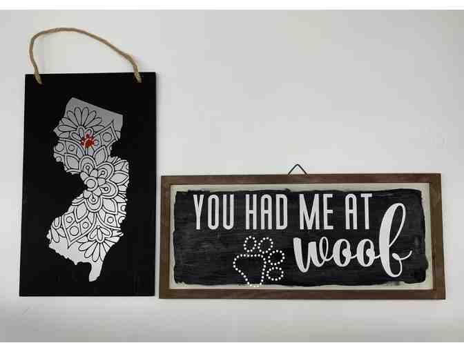 "You Had Me At Woof" and NJ Paw Print Plaques