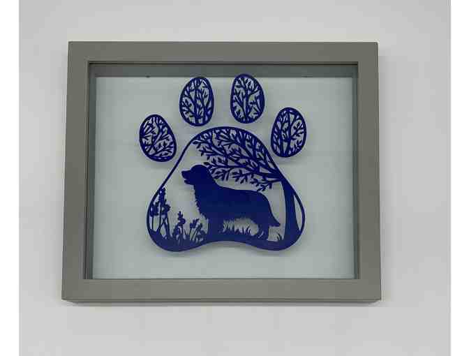 This very beautiful and unique wall hanging is crafted in the art of paper-cutting. The design, all in cobalt blue, is a side silhouette of a golden retriever with nature all around (trees above and flowers below). The entire design is cut in the shape of a paw print which is encased by glass, front and back, in a taupe-colored matte frame. The artwork measures approx. 6.5 in. Wide x 7 in. High. A nice addition to any golden lover’s home!