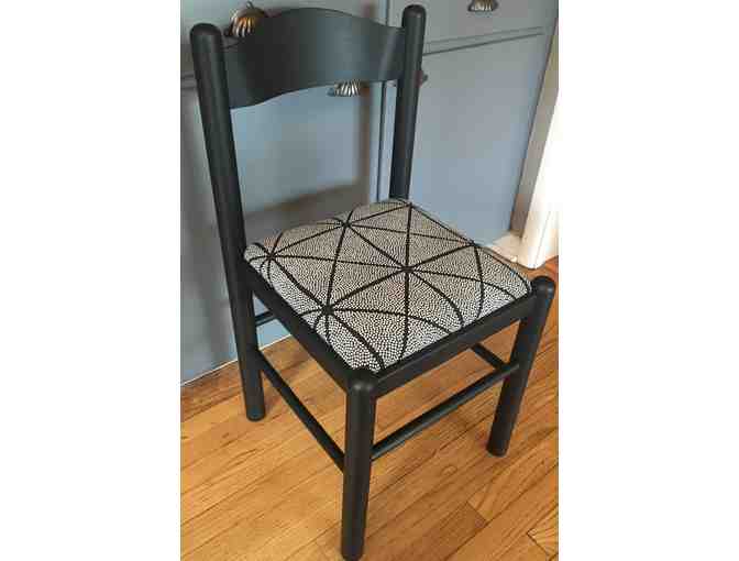 Kate has taken a simple chair & has refinished it in lamp black milk paint. The seat has been updated with a black & white printed cotton fabric.