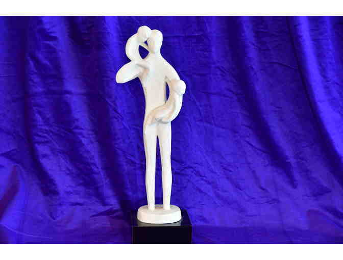 This beautiful stone sculpture is entitiled "Family Pride" and it measures 22 by 6 inches. The sculpture depicts a man with his children presenting a tender moment for you to enjoy.