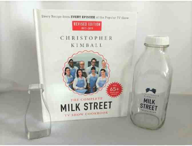This Channel 47 "Milk Street" package includes the complete 2017-2019 revised edition Milk Street TV show hardcover cookbook by Christopher Kimball with 400 pages of delicious recipes. You will also receive a five-inch metal milk bottle cookie cutter, and a one-quart glass Milk Street bottle. Channel your inner Milk Street cooking with this great set of cooking goodies.