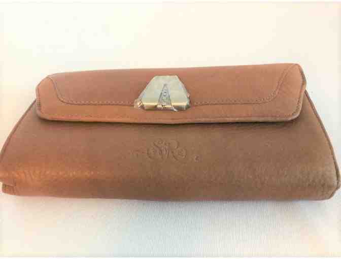 The Longaberger #23427275 "So Rachel" wallet was crafted with chestnut brown leather. Features include a front snap closure with zipper compartment on the back and inside, slots for credit cards, a pen holder, and a separate checkbook holder with additional compartments. The wallet measures 7.5 inches wide and four inches high in the closed folded position.