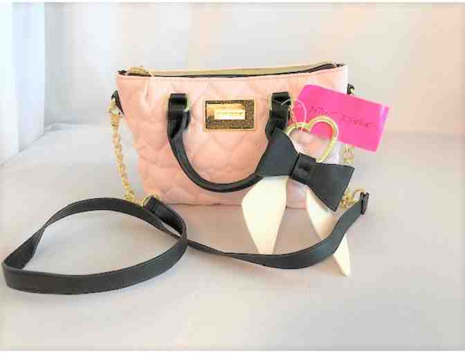 This Betsey Johnson cross body pinch satchel bag is number BM19265. The blush or pink quilted heart design bag features gold and black handles and strap, and a large black and white bow with the Betsey Johnson signature gold heart. The bag measures 12 by 9 by 6 inches and is new with the original tags.